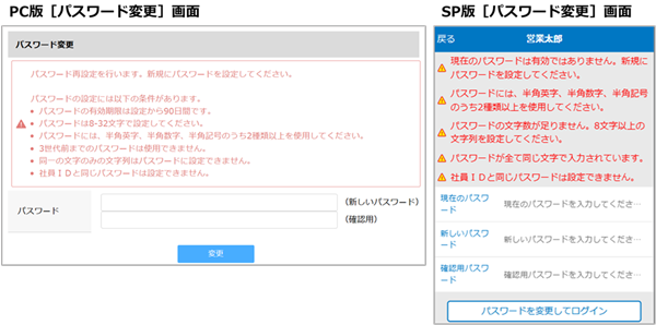 - 設定完了後、現在のパスワードがセキュリティポリシーを満たしていないユーザーには、次回ログイン時に[パスワード変更]画面が自動で表示されます。