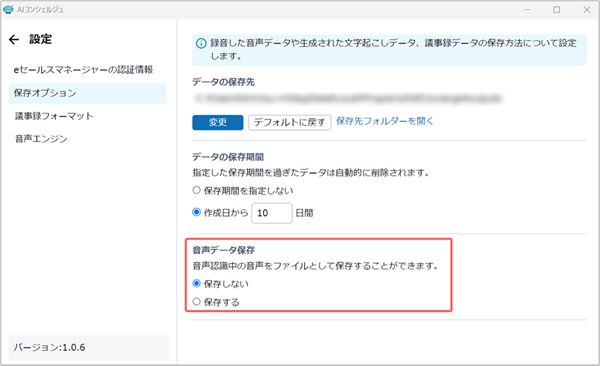 | 保存しない | 音声認識中の音声データを保存しません。 |