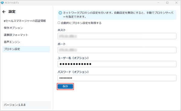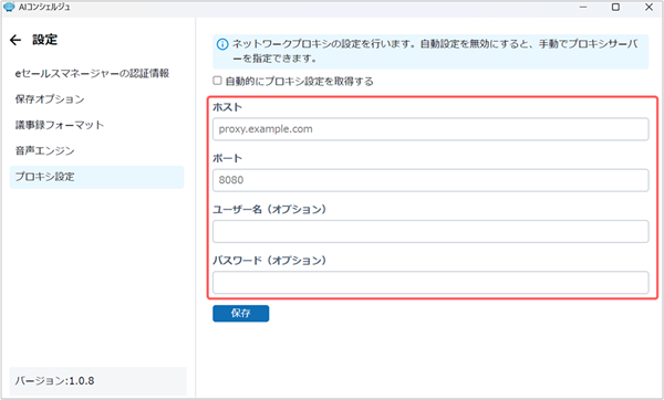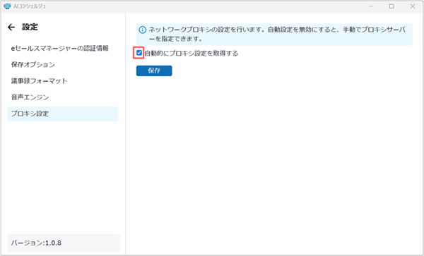 - 「自動的にプロキシ設定を取得する」にチェックが入っている場合は、Windowsのプロキシ設定がAIコンシェルジュアプリに自動で適用されます。