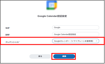 6. [クレデンシャル]に「Googleカレンダー(ソフトブレーン本番環境)」を選択して、[連携]ボタンをクリックします。