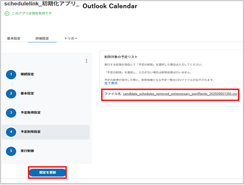 6. 重複チェックの結果出力されたOutlook Calendar用ファイルをアップロードして「設定を更新」をクリックします。