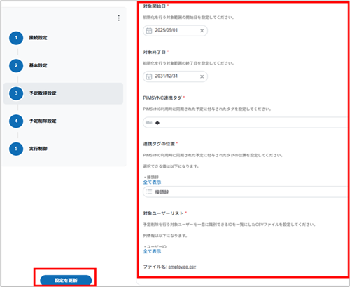 5. 各項目を入力し、[予定取得設定]をクリックします。